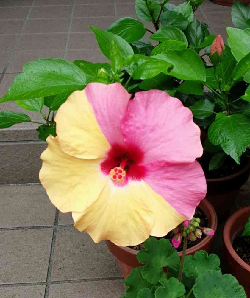 [@id:50556] さん、ありがとうございます。私の母親です。毎年黄色いハイビスカスとアカイハイビスの二つの鉢植えを隣同士においています。このハイビスカス一輪だけがこのように咲きました。びっくりでした。