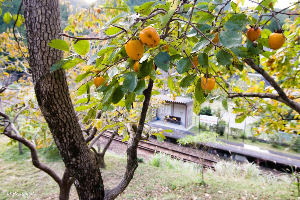大きなシイノキがある東平寺から坂を下るとJR名松線の比津駅に至ります。急坂を下りていくと,オレンジの実のなる柿の木の合間から,駅が見えてきました。すこし待ってみましたが,なかなか列車も一緒に写すのは難しかったです。