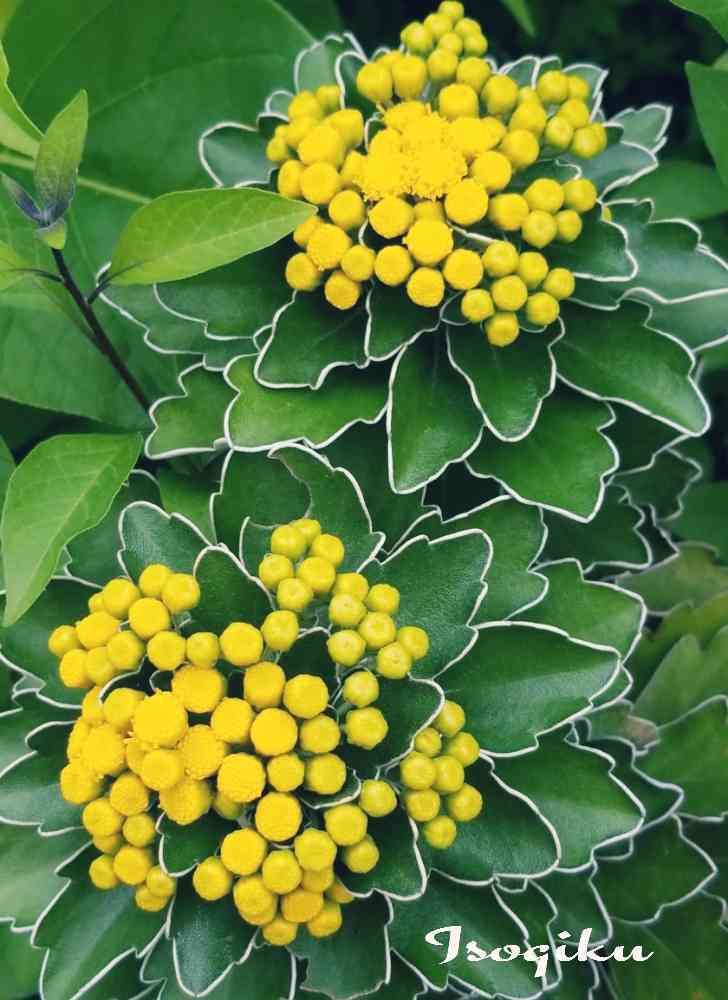 小さな黄色の頭状花を散房状に咲いて 葉周囲に白い縁取りマーカーが とても印象的な磯菊でした