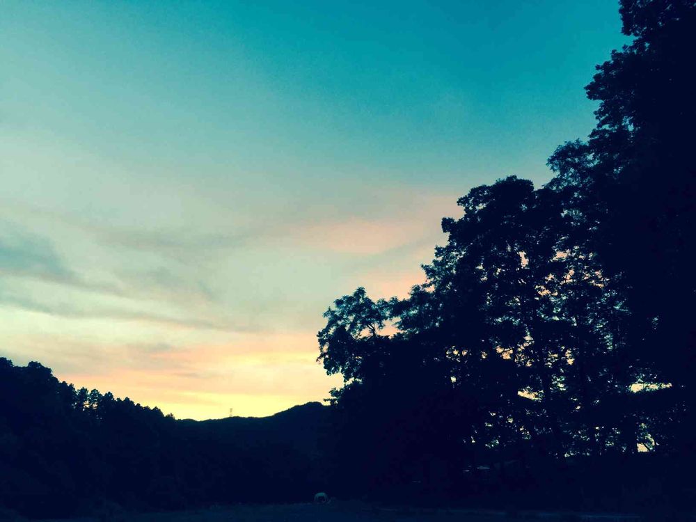 河原の木と夕焼け。水遊びの後に川に石投げて水切りした。1回しか跳ねない…。子供でも2回跳ねるのに( ㅍ_ㅍ )なぜ…