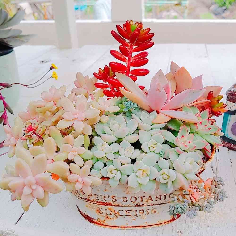 葉挿しから育てて作った寄せ植えが大きくなって色づき、可愛くなりました❣