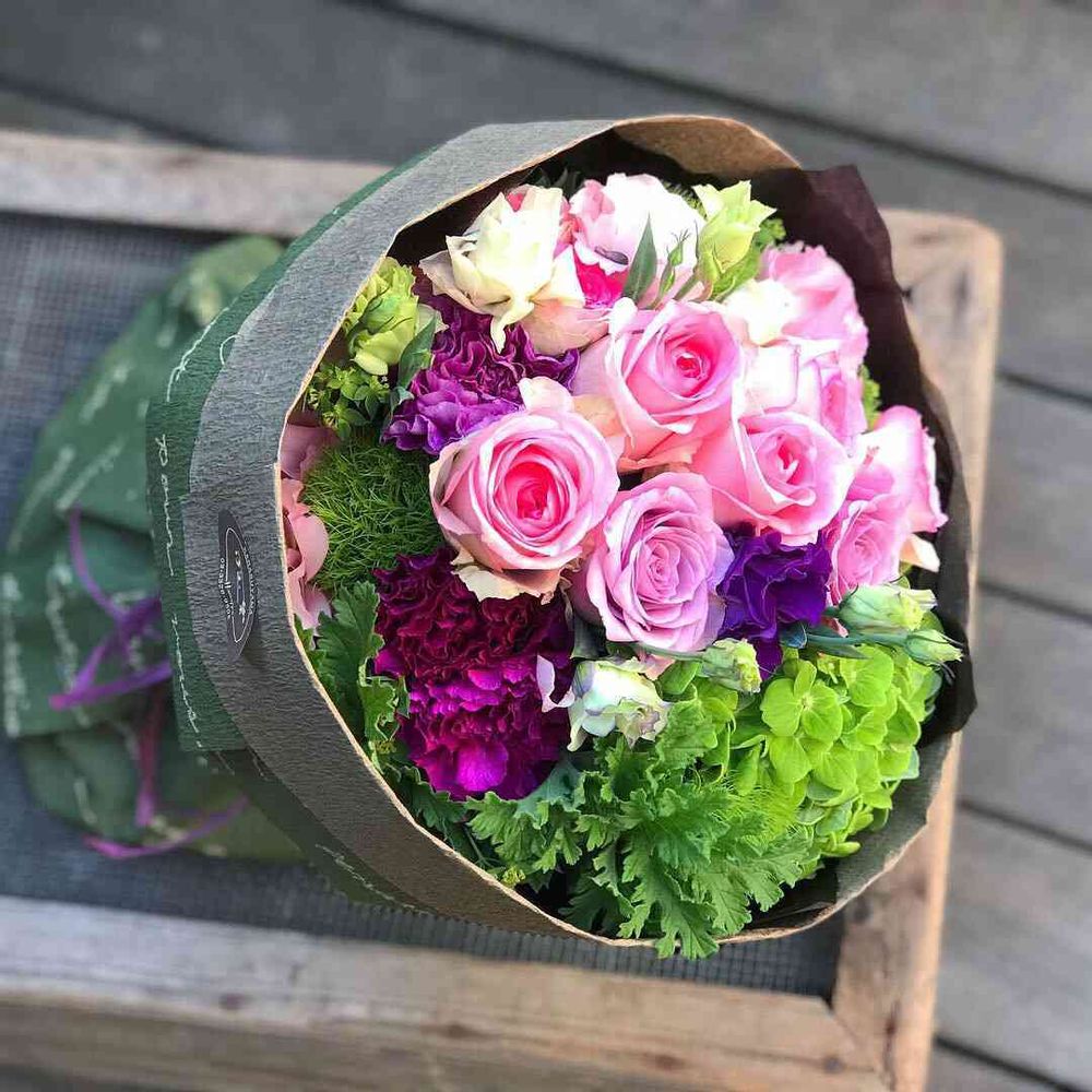 お母様の誕生日にピンクのグラデーションに紫を入れたブーケをお任せ頂きました😙