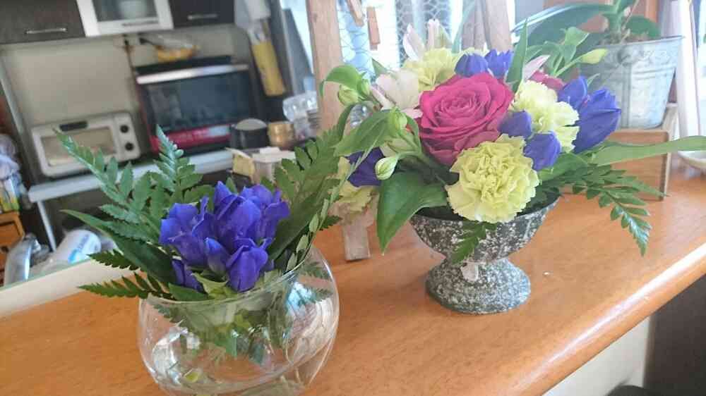 関東梅雨明け。とっても暑いですが、お花が無いのは寂しいから、小さなアレンジメント作りました。手前は残ったリンドウちゃん達をガラスに。