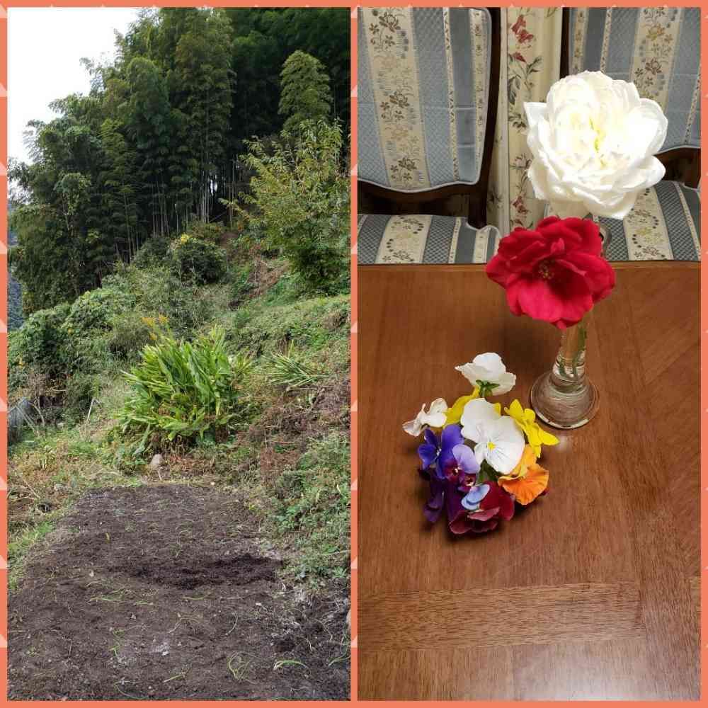 右側は、今日剪定したバラとパンジー、ビオラを花瓶とカップに生けた風景
