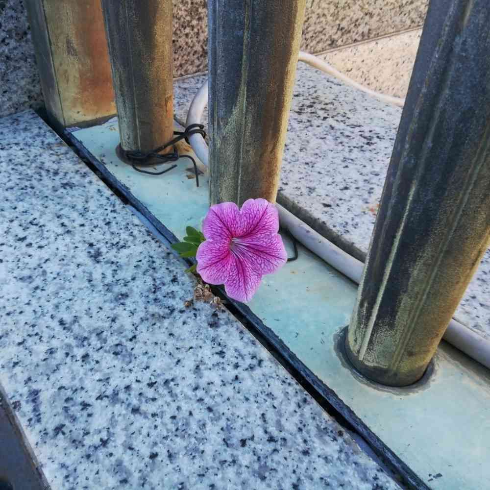 欄干の片隅に咲くペチュニア。