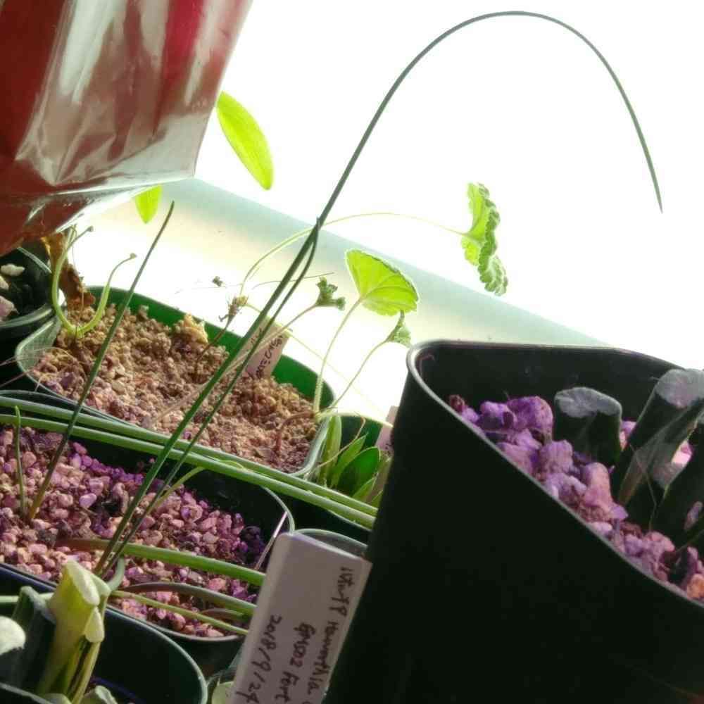 2年目になろうかという今年は、種まき時点のダラーんとのびのびの葉のタイプが出たあと、曲がる葉がで生えてきた模様。そもそもこの際には強い光を当ててはいますが…。早くもクルクルするのかな?(40000luxオーバーの光)