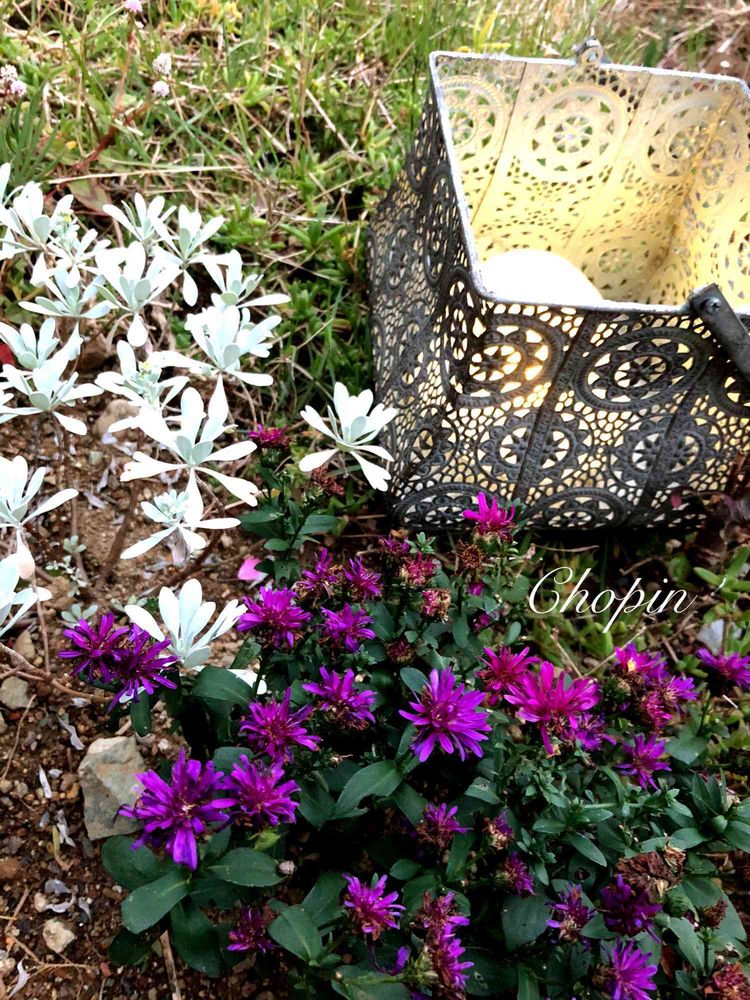 モクビャッコウ(たぶん)と 名前を忘れた紫のお花とランプです✨