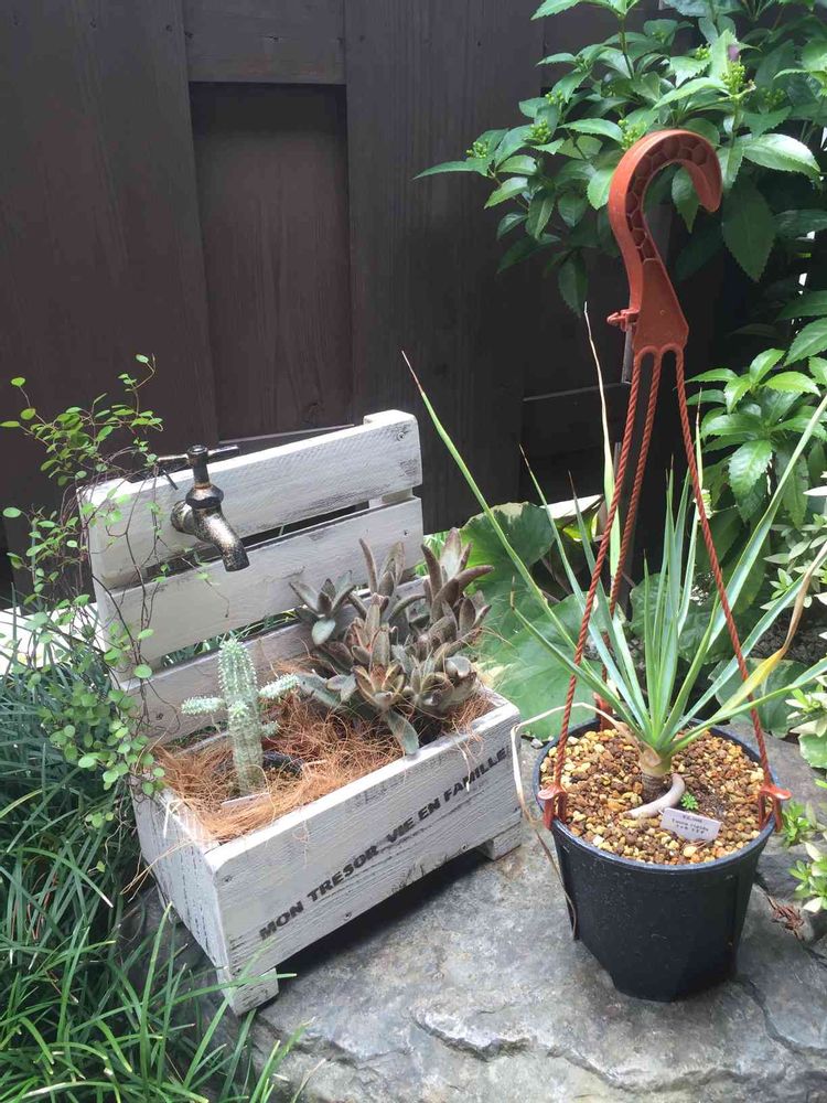 新築祝いで頂いた蛇口付きの植物入れも中身が枯れたので新しくサボテン(ユーホルビアマミラリスバリエガータ)と多肉(テディベア)を新調