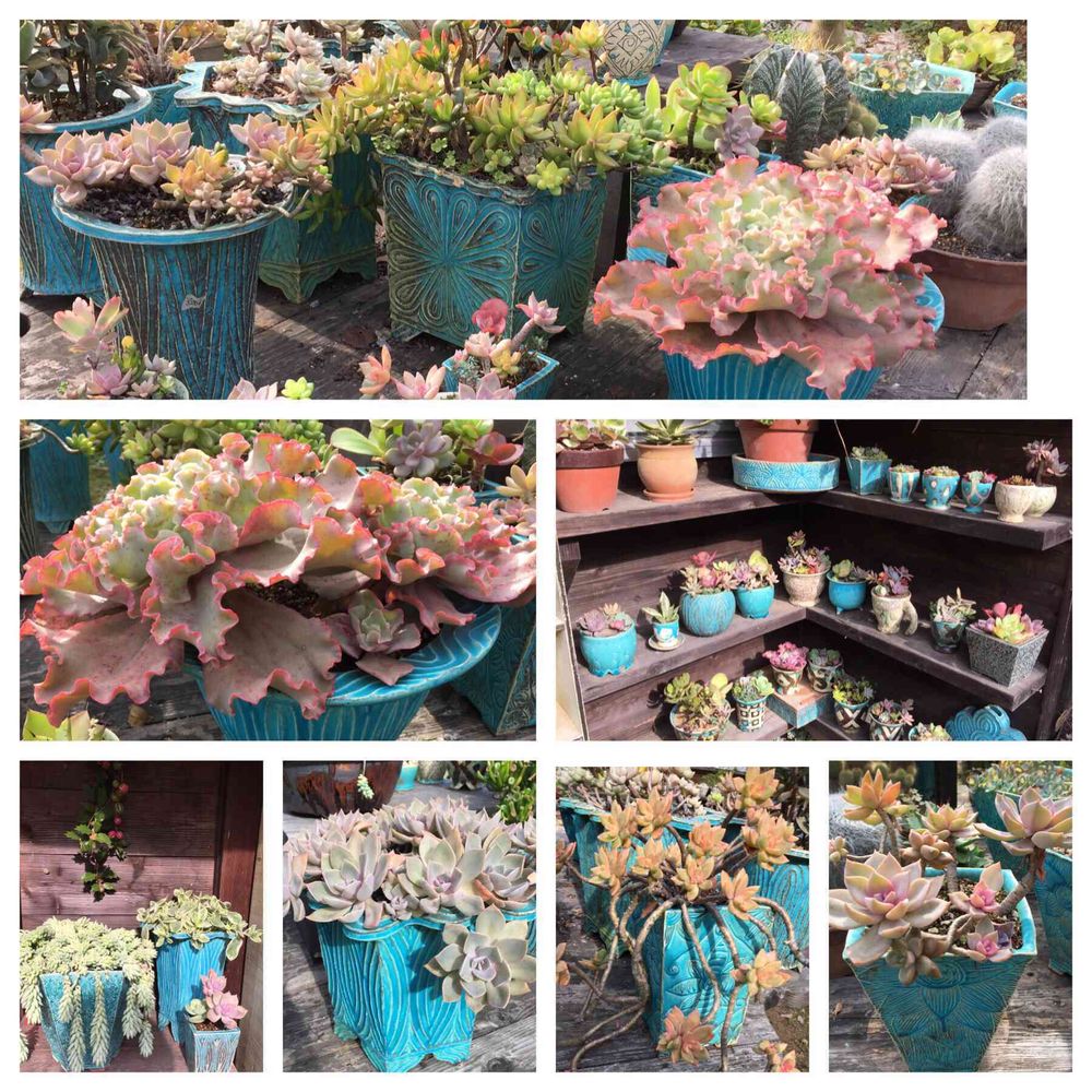 ターゴイスブルーの焼き物に多肉ちゃんがいっぱい✨