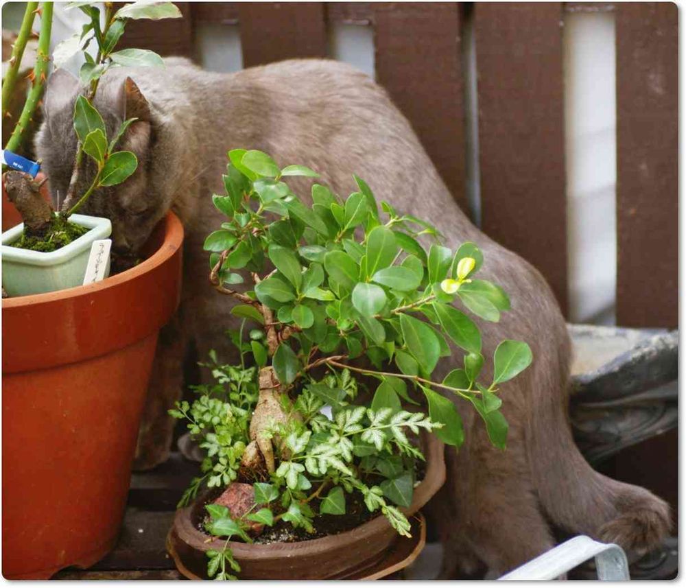ガジュマルの寄せ植え。ガジュマルはほっとくと上に放射状に伸びてしまうので、針金をかけて枝を少し下向きに誘引している。横からなのでどうにも格好がつかない姿でお見せしているが、うちの猫が一緒に写ってくれたのでGSに上げたかっただけとも言う。