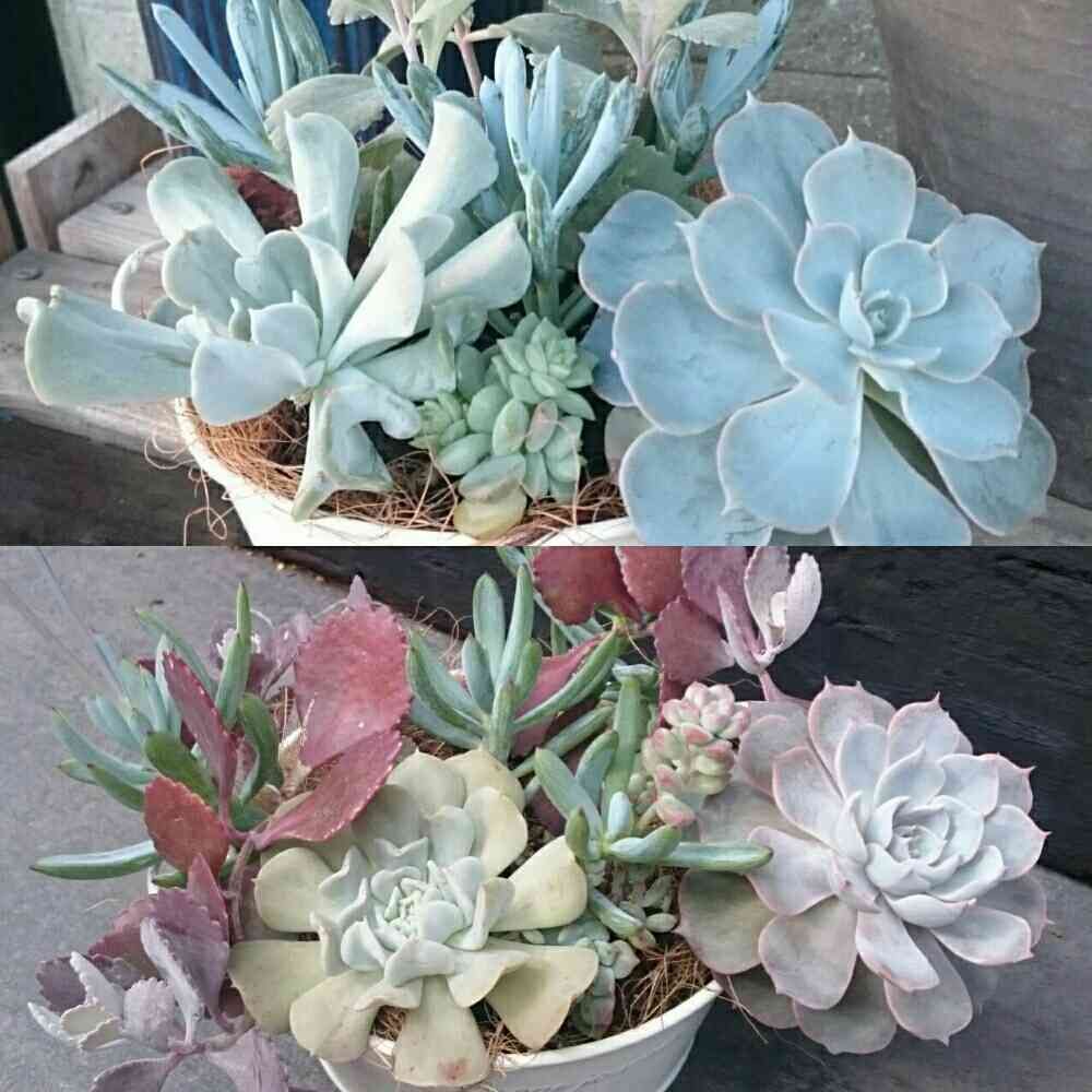 上2018年4月ホームセンターで購入。屋内管理されていたのもあり、今思うとかなり徒長していたんだなあ。でもこの青い花束のような青揃えの多肉がきれいだなあと感動した。下2018年11月。雨ざらし屋外管理で紅葉中。ここまで締まったよ。