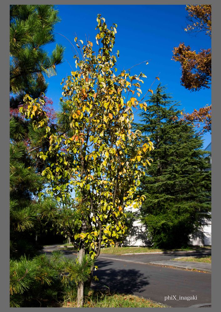 昨年は1つも実がならず心配しましたが,今年はこのカリンの樹から10個ほどの実を収穫しました。今,部屋の中にあり,甘い良いにおいを振りまいております。キイロやオレンジに紅葉して,そろそろ風に散っていくと思うので,記念に一枚。この日は抜けるような青空で素晴らしい天気でした。