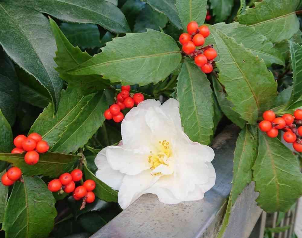 白いサザンカと千両