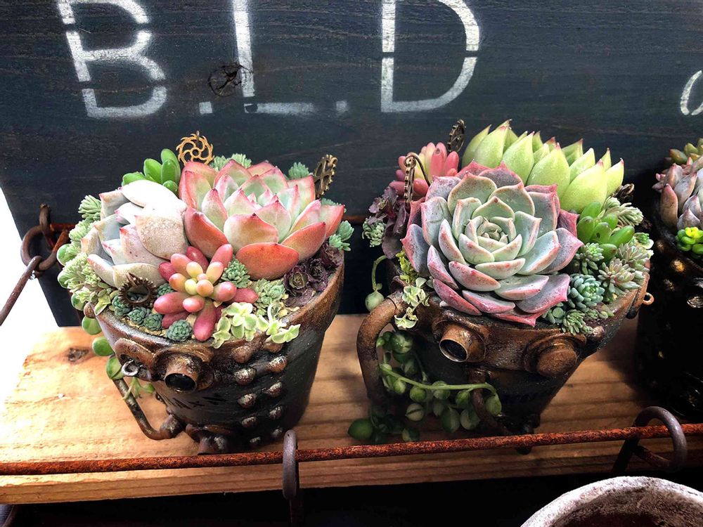 nomachanさんのスチパン鉢に頑張って寄せ植えしてきました✨✨向かって左が私作、右側のグリネが絡まってるのが旦那氏作🤣✨✨