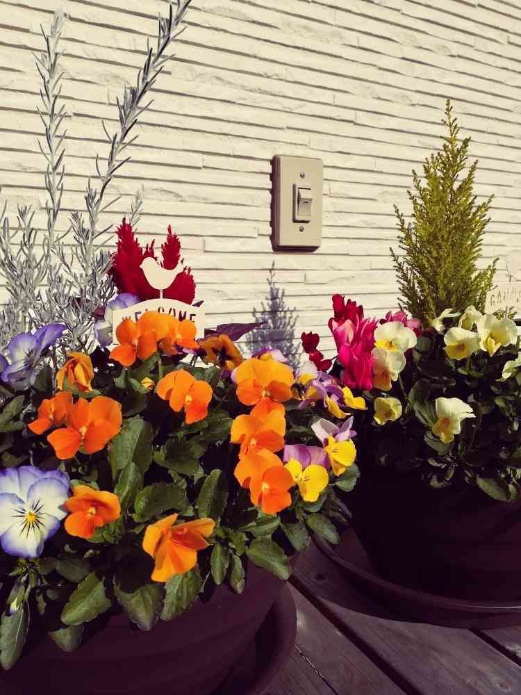 1ヶ月前に寄せ植えしたビオラが次々と花を咲かせてくれてうれしい😍
