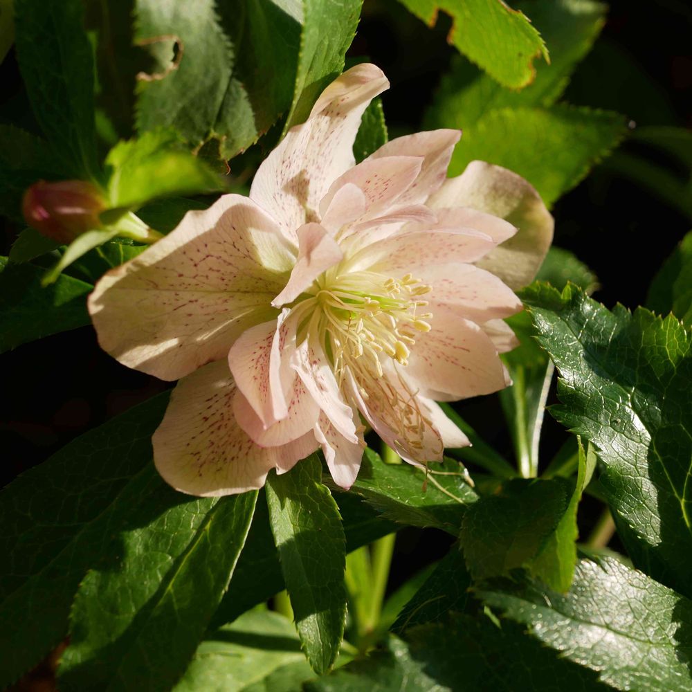 明るいピンクにパウダー状のスポットが入るやさしい色合い。優雅な感じのクリスマスローズです。左に蕾もあり、楽しみ💕