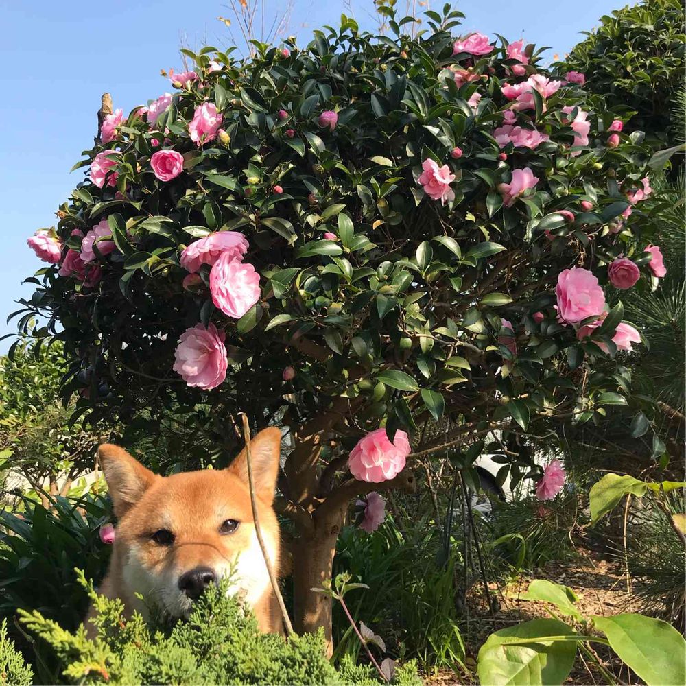 柴犬と山茶花、どちらも 日本的な組み合わせですね😁。