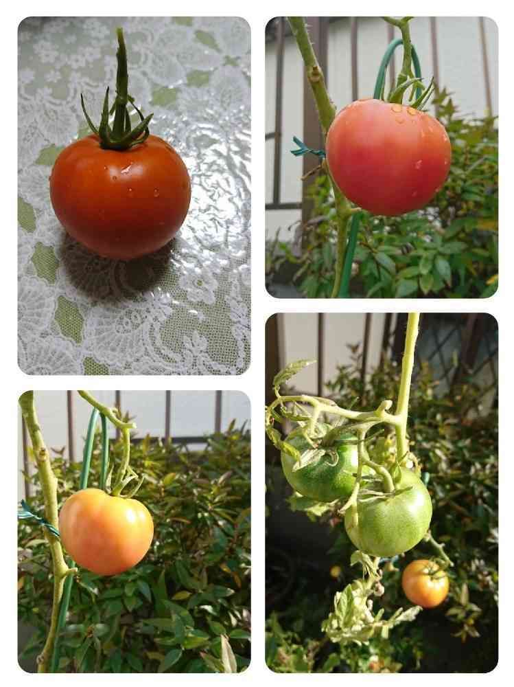 ミニバラの鉢のトマト🍅2個目がようやく赤くなり、待ちきれなくて収穫しました😆