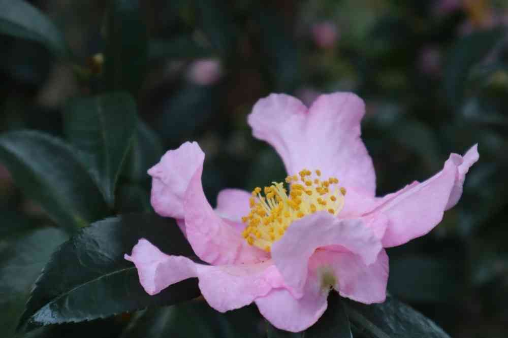 サザンカ?の桃色。よく咲いていました。お花がいろいろな向きなので、ちょうど良さげなところを探しました(笑)