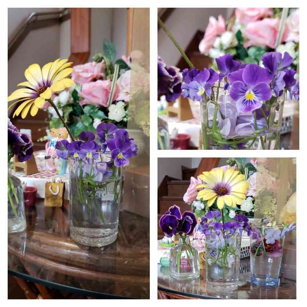 ビオラをグルーっとコップの縁に並べて真ん中に黄色の花を挿しただけなのですが。