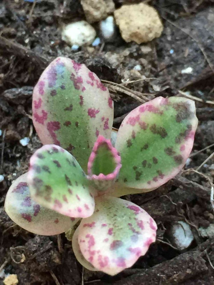 子宝草、不死鳥、いっぱい子供が出来て困っているのにどうしてもピンクの子が欲しくてお迎えした不死鳥錦さん、まだまだ2センチ位です。