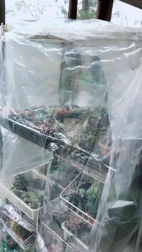 この他の、ゼラニウムとツユクサ系は簡単ビニール温室に入れ、他の植物はプチプチで巻いたりビニール袋を被せて見たりしています。去年ビニール袋を被せていただけでオリヅルランが生き残ったので再度実験!