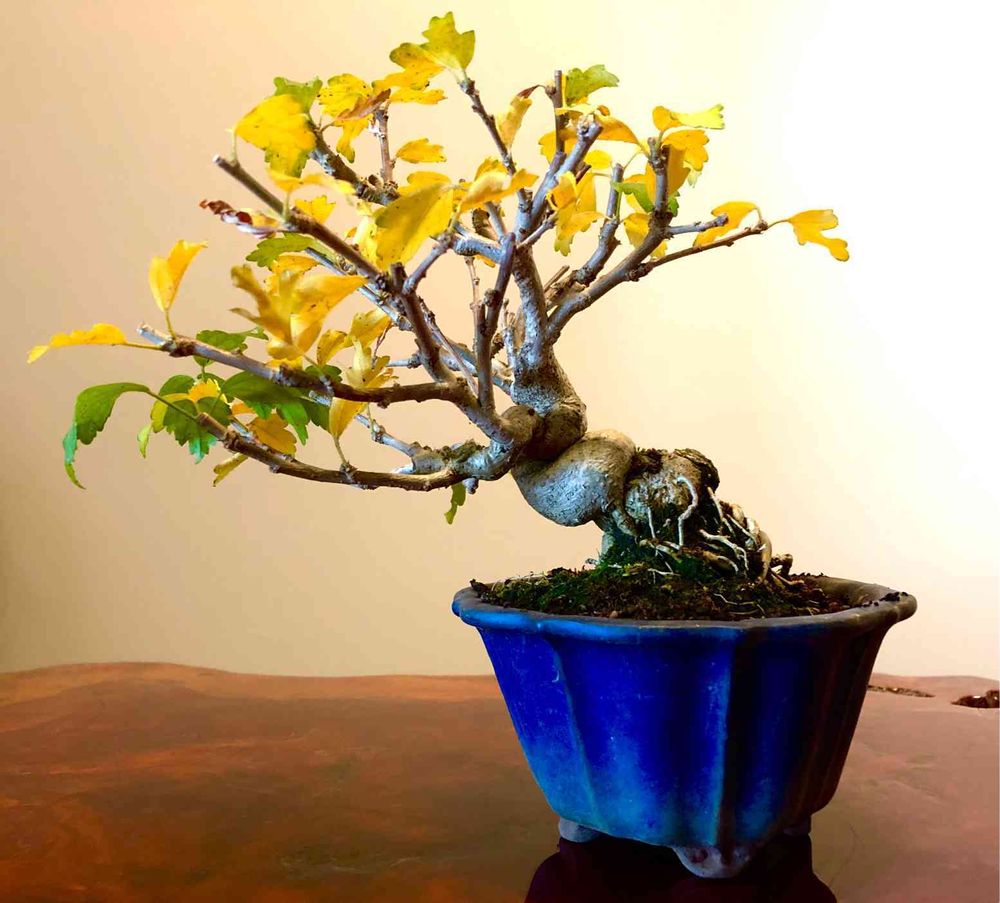 ベランダで盆栽育ててます。樹種は観葉植物や南方系が好きで、小さい鉢に収めてます。