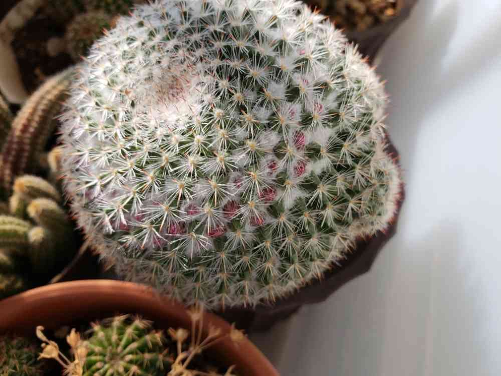 ベランダのチームサボテンらをいらない衣装ケースに入れていたら玉翁にピンクの花芽がチョロチョロ見え始めてました。