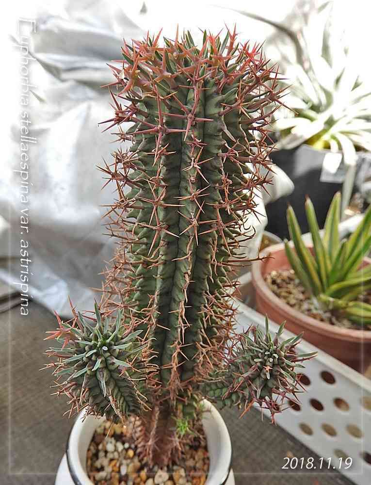 ユーフォルビア・秋星冠三号……今は二号。かつての二号は、突然★になりました。三号だったこっちは順調に成長中。巨大化している一号と同じタイプらしく棘は赤く通年棘を出し、仔吹きもしてる。