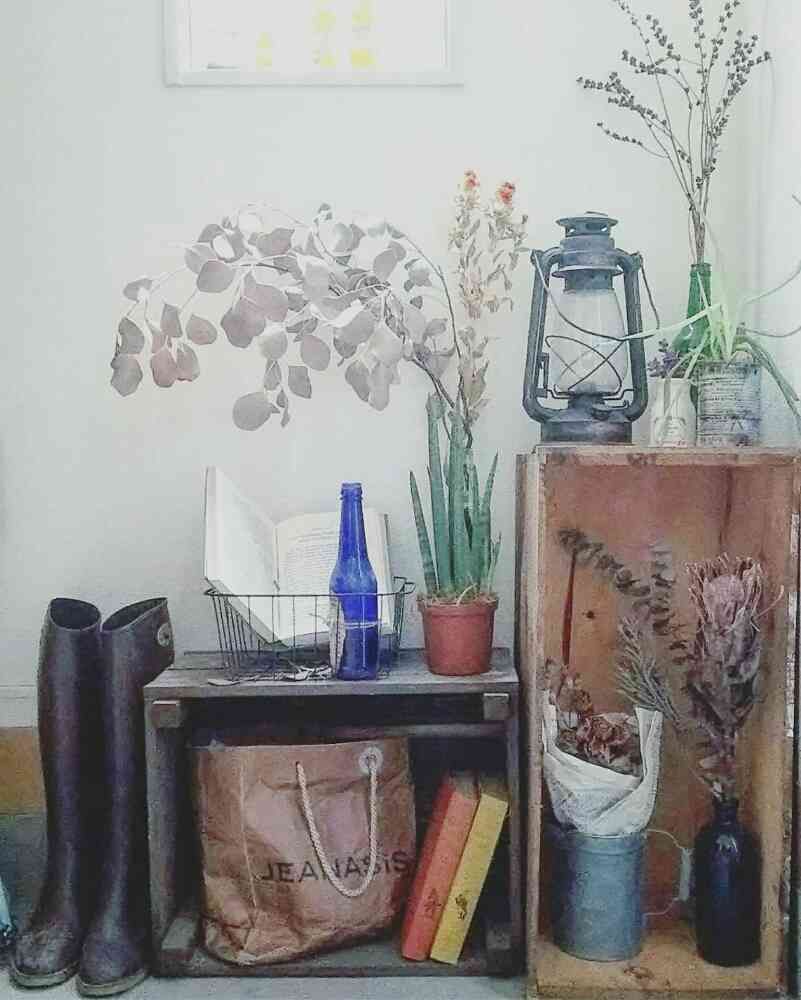 DIYで作った木箱と縦置きのリンゴ箱でドライと雑貨とgreenをディスプレイしてます✨