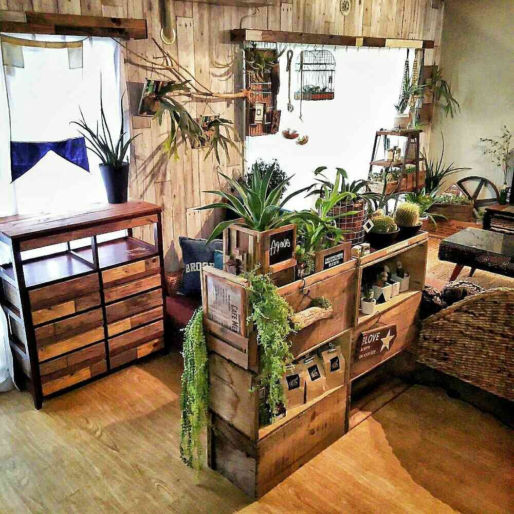 りんご箱で仕切りをつくり、植物を立体的に配置してます。