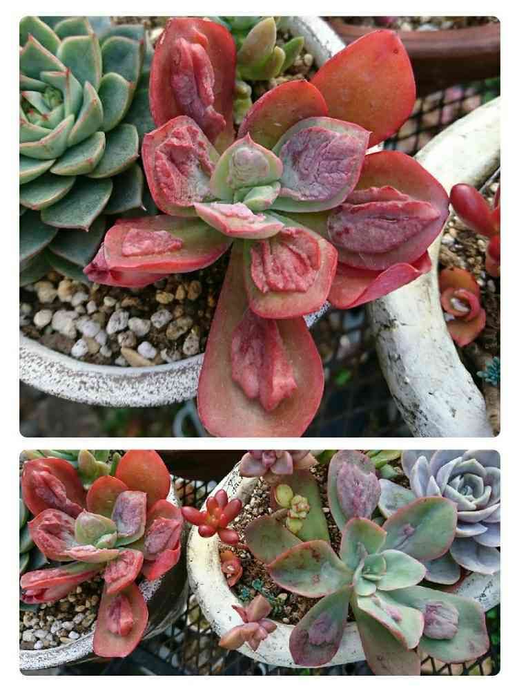 緑の方はかなり日陰だった。赤い方はガッツリ水切られてた。赤はタグなし、鉢も違うから生産者も違うか。