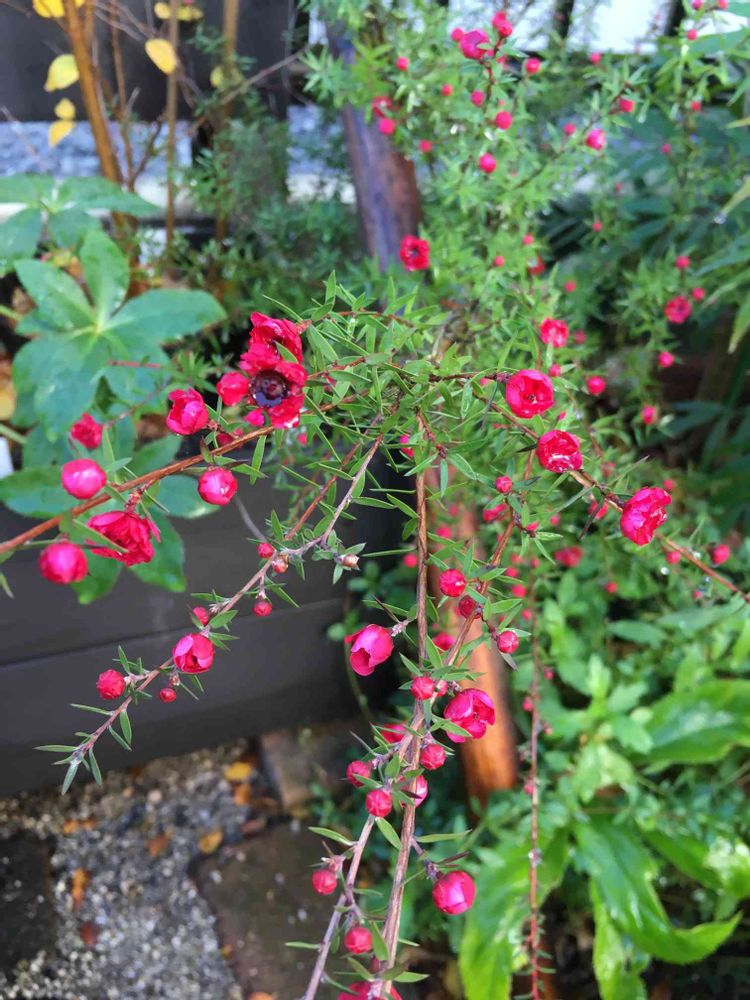 ギョリュウバイは赤、ピンク色も3年前のが今咲いてるよ🌸