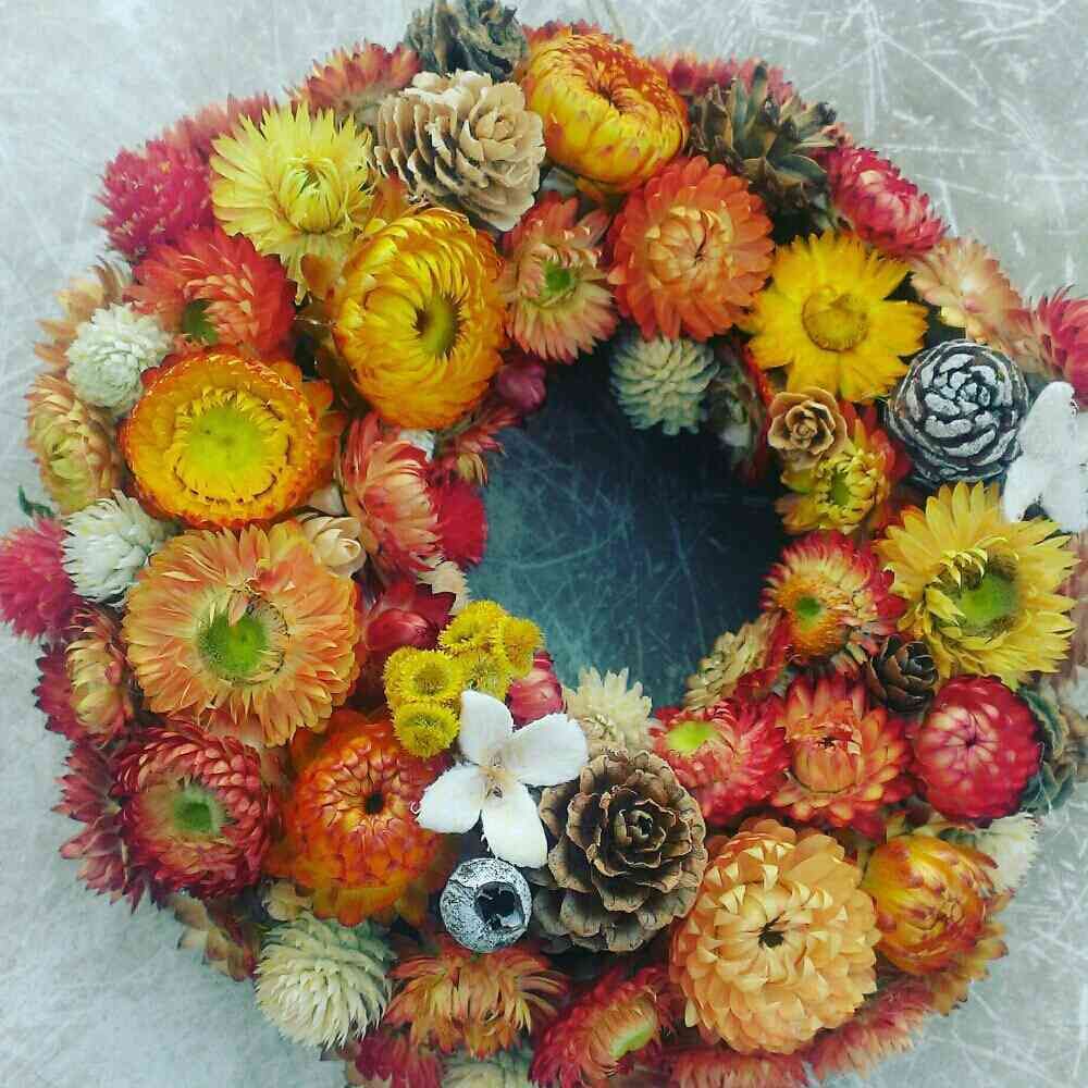 実家の母が育ててドライになったヘリクサム(貝細工)をリースにしました。夏向きのビタミンカラー。