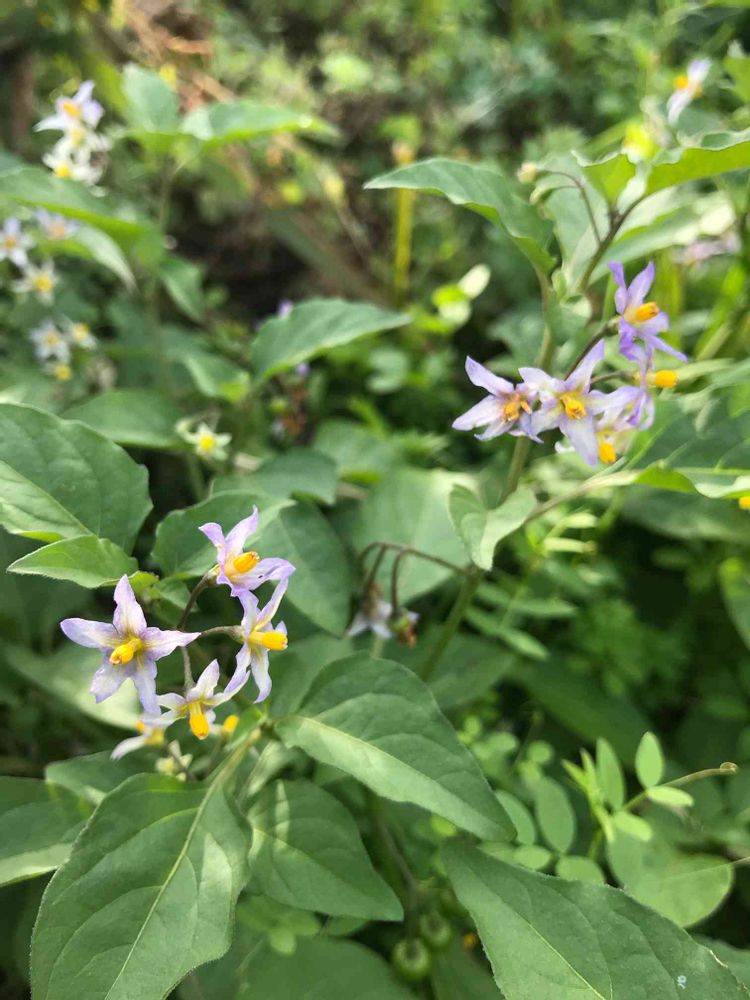 民家の空き地に咲いてました、初めて見たナスの花みたいな紫の花。