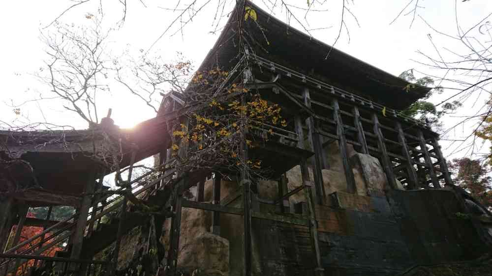 四方懸造り(しほうかけづくり)の紅葉 のはずだったんですが境内のお店の話では、こんな山まで塩害の被害なのだそうです。