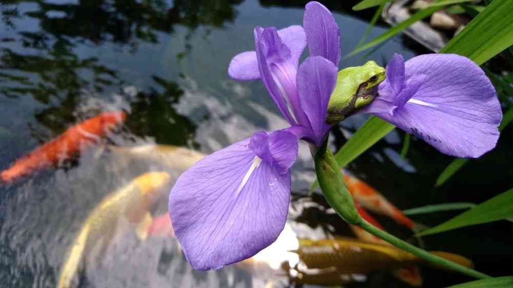 春~初夏に咲くカキツバタの花と、この花の上がお気に入りのアマガエルです🐸