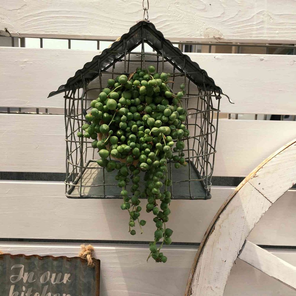 グリーンネックレスを鳥かごに入れました。