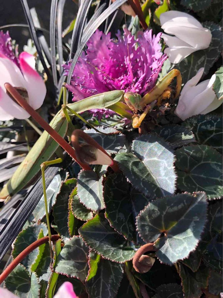 昨日まで姫ヒイラギに止まっていたカマキリ君、今朝は寄せ植えのお花の上に移動してました😊