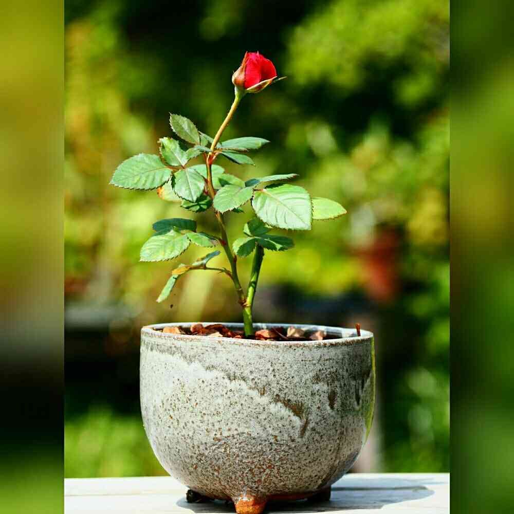 挿し木をしてたミニ薔薇に蕾がついたので和風な鉢に植え替えました。