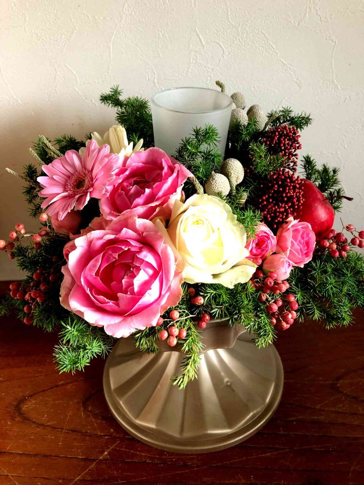 バラ、SPバラ、スキミア、ヒムロスギ、ガーベラ、シルバーブルミア、姫リンゴ、ペッパーベリーとキャンドルホルダーです。