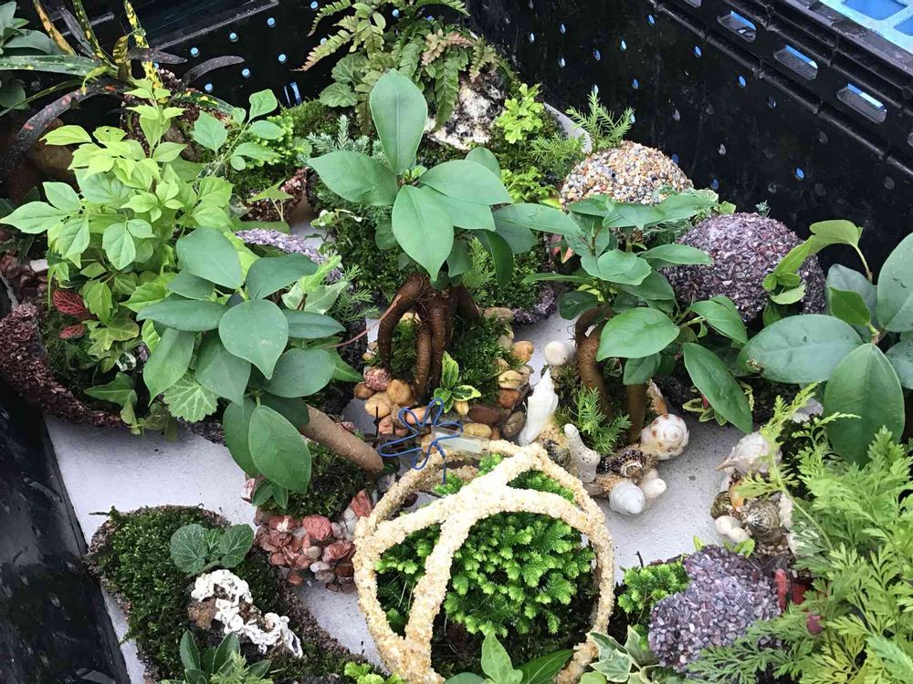 貝殻と砂利を樹脂で固めていろいろな鉢を作っています。 また、ロックウールを使った誰もが簡単にできる寄せ植えを紹介しています。