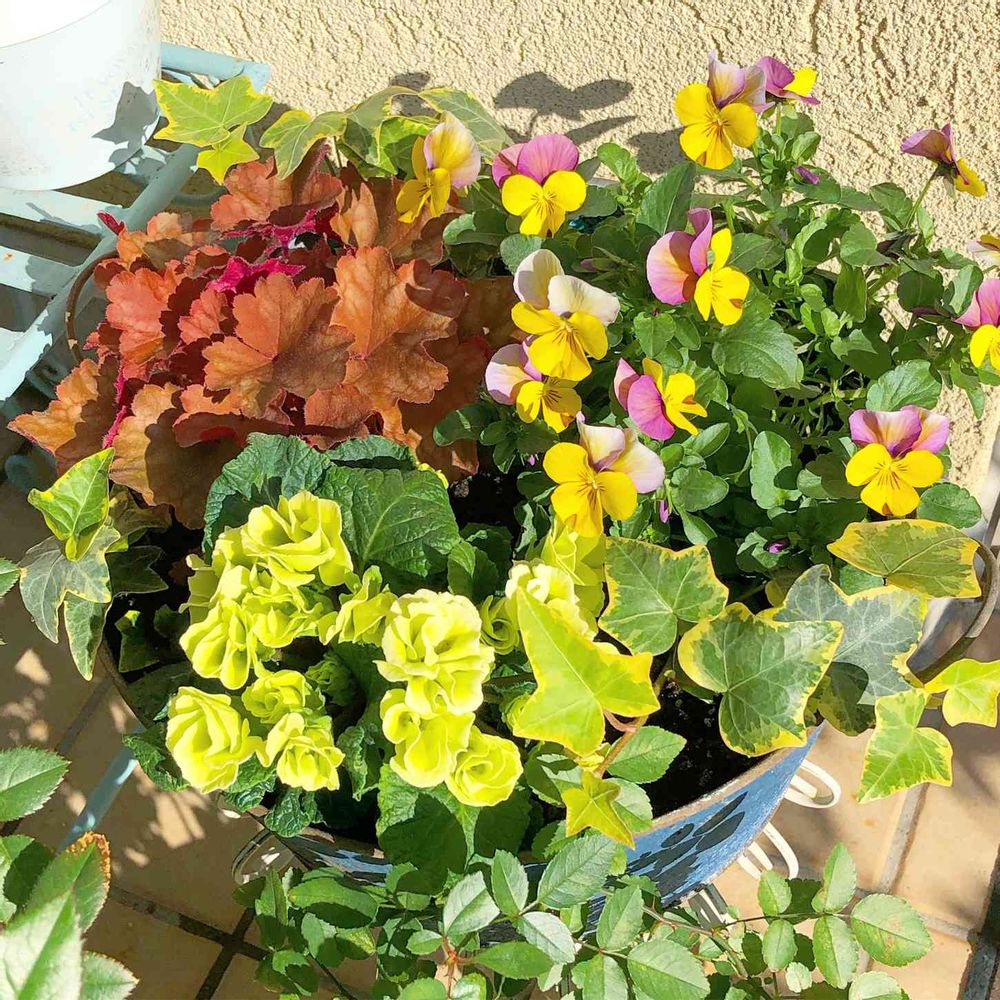 ヒューケラ、ビオラ、それとアイビーとともに。