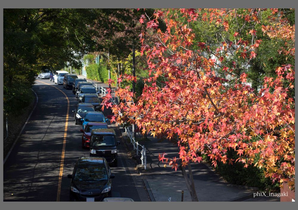 植物園と動物園をつないでいる陸橋の上から眺めるとモミジバフウの赤オレンジの紅葉がとっても綺麗でした。綺麗な景色を眺めようと訪れる車の渋滞が伸びていました。