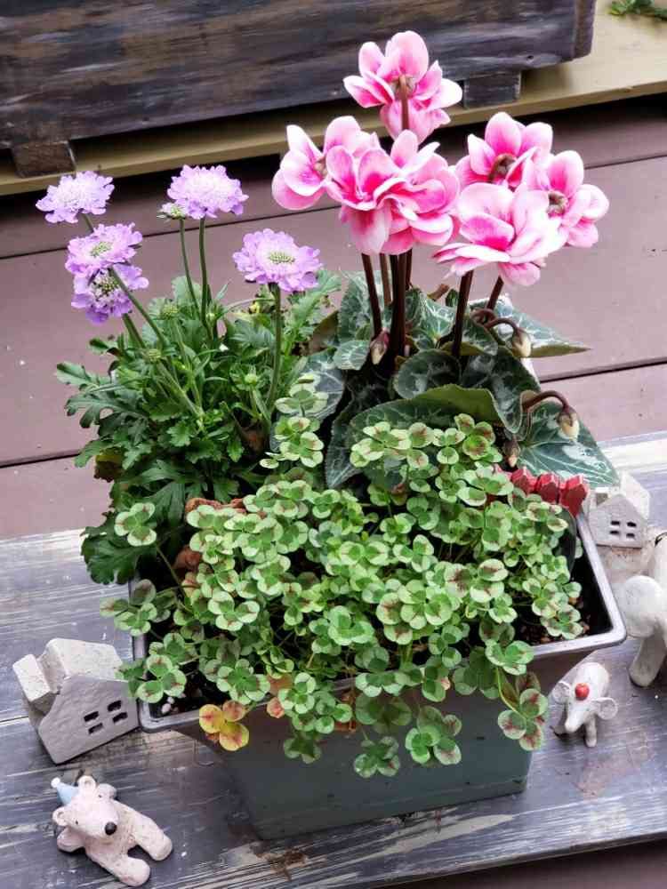 ガーデンシクラメンもスカンビオサもとっても可愛いけど、手前のクローバーが何とも言えぬ控えめな愛くるしい姿で(∩˘ω˘∩ )♡よくよく見ると、左下のクローバーは2枚ほど紅葉?してるのかしら?笑笑