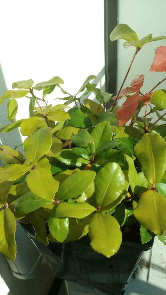 ウバメガシ。発芽率がえらくよかった。日当たりが悪いのか、緑が薄い。奥で紅葉してるのは紛れ込んでいたコナラ。