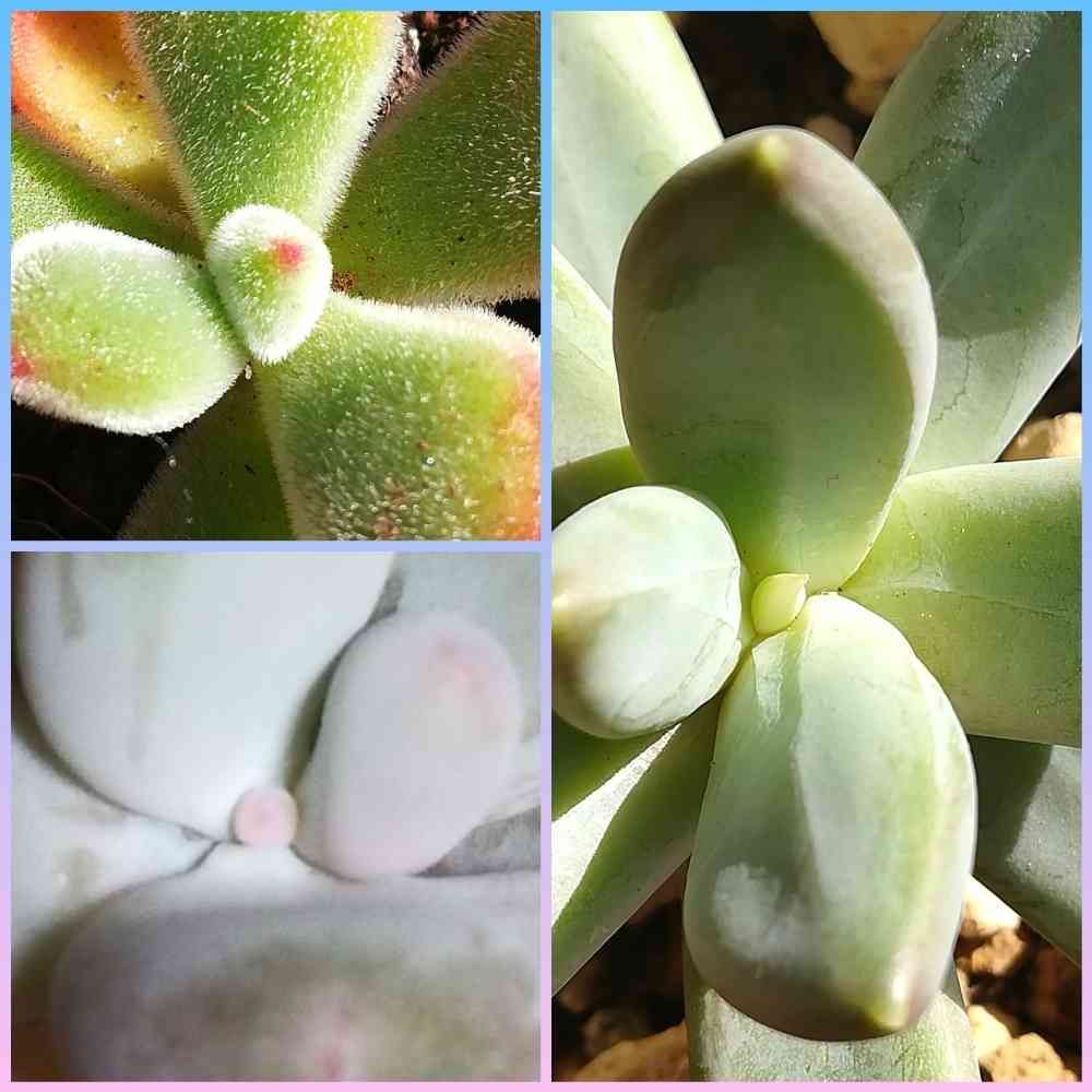 多肉は寒くなったら成長しないのかと思ってたけど、ぴょこんと出て来た☺️🌱昨日の朧月の花芽もビックリ。日光浴してるからかな?今年の冬は暖かくて、初心者の私と多肉さん達には助かりますね😁