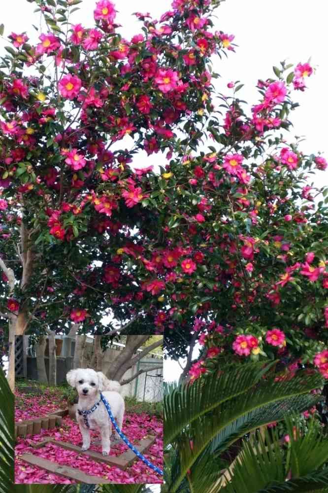 ラッキーちゃん山茶花の花びら絨毯に映えてますね✨✨