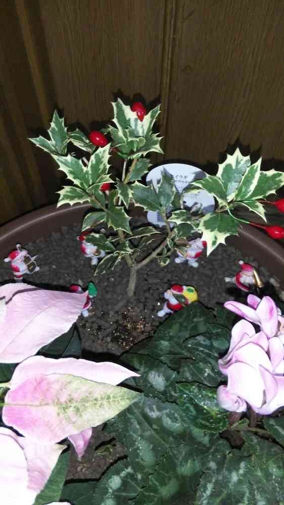 ヒイラギの根元でサンタさん達がこっそり演奏会を開いています🎅