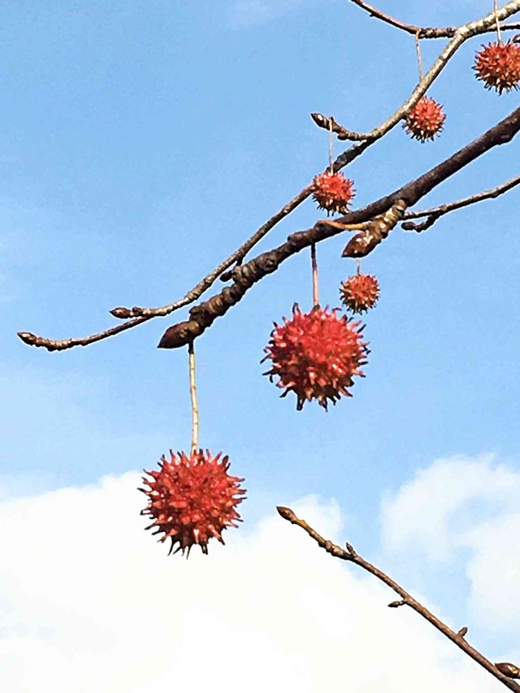 モミジバフウの実、陽の当たる方だけ赤く色付いてる🤗